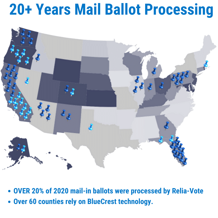 When it comes to managing mail-in ballots, there is simply no room for error or delays. BlueCrest Relia-Vote mail ballot automation solutions have been processing Vote-by-Mail and Absentee ballots for over 20 years.